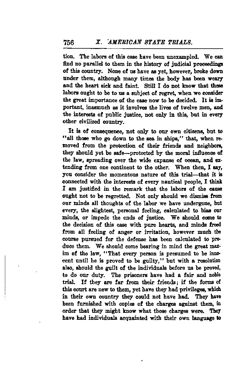 This case is of consequence not only to our own citizens but to "all those who go down to the sea in ships." When removed from the protection of their friends and neighbors, they should still be safeguarded by the moral influence of the law, which extends over the vast expanse of the ocean and from one continent to another. When you consider the momentous nature of this trial and its connection to the interests of every seafaring people, I believe I am justified in saying that the efforts expended on this cause should not be regretted.