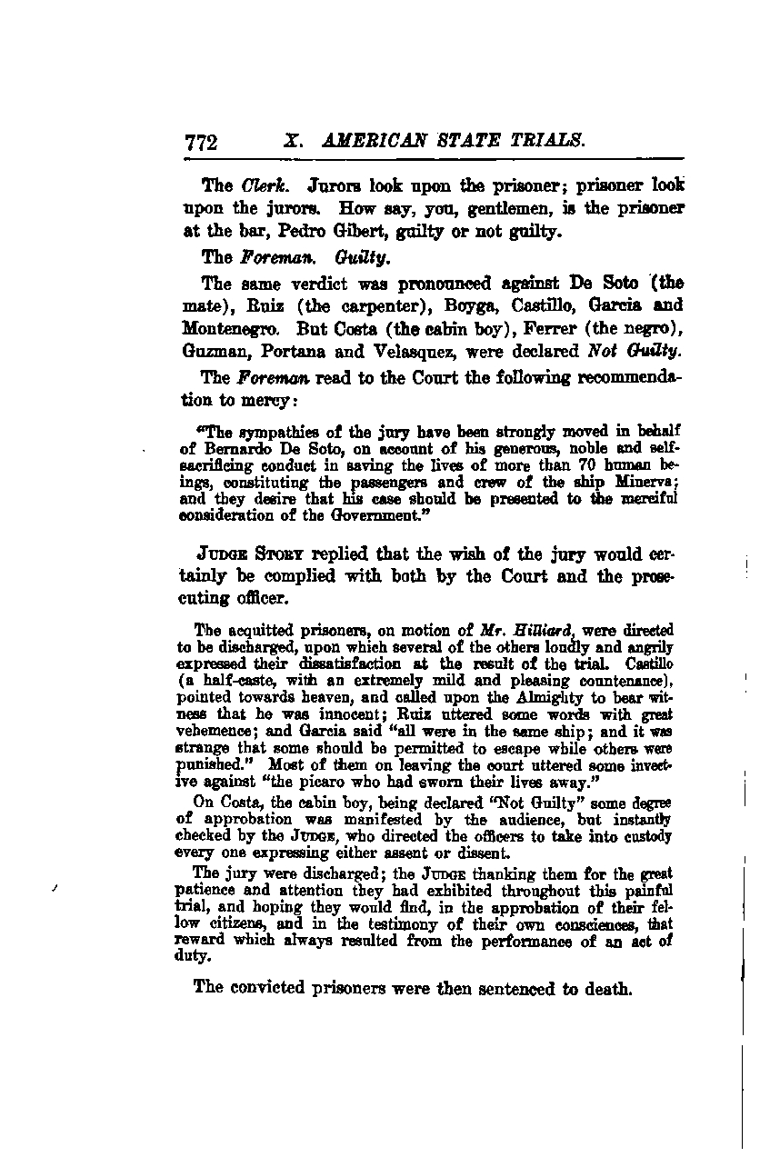 The same verdict was pronounced against De Soto (the mate), Ruiz (the carpenter), Boyga, Castille, Garcia, and Montenegro. However, Costa (the cabin boy), Ferrer (the negro), Guzman, Portana, and Velasquez were declared not guilty.
