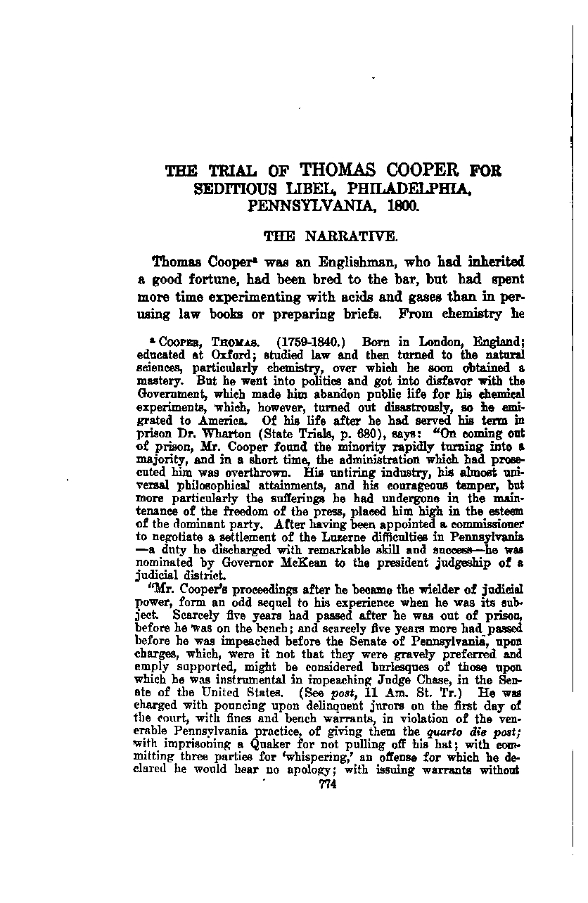 The Trial of Thomas Cooper for Seditious Libel, Philadelphia, Pennsylvania, 1800