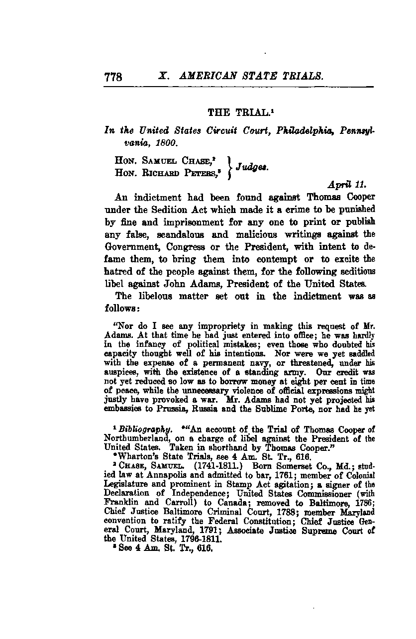 An indictment had been found against Thomas Cooper under the Sedition Act, which made it a crime to be punished by fine and imprisonment for anyone to print or publish any false, scandalous, and malicious writings against the Government, Congress, or the President, with intent to defame them, to bring them into contempt, or to excite the hatred of the people against them. This was for the following seditious libel against John Adams, President of the United States.