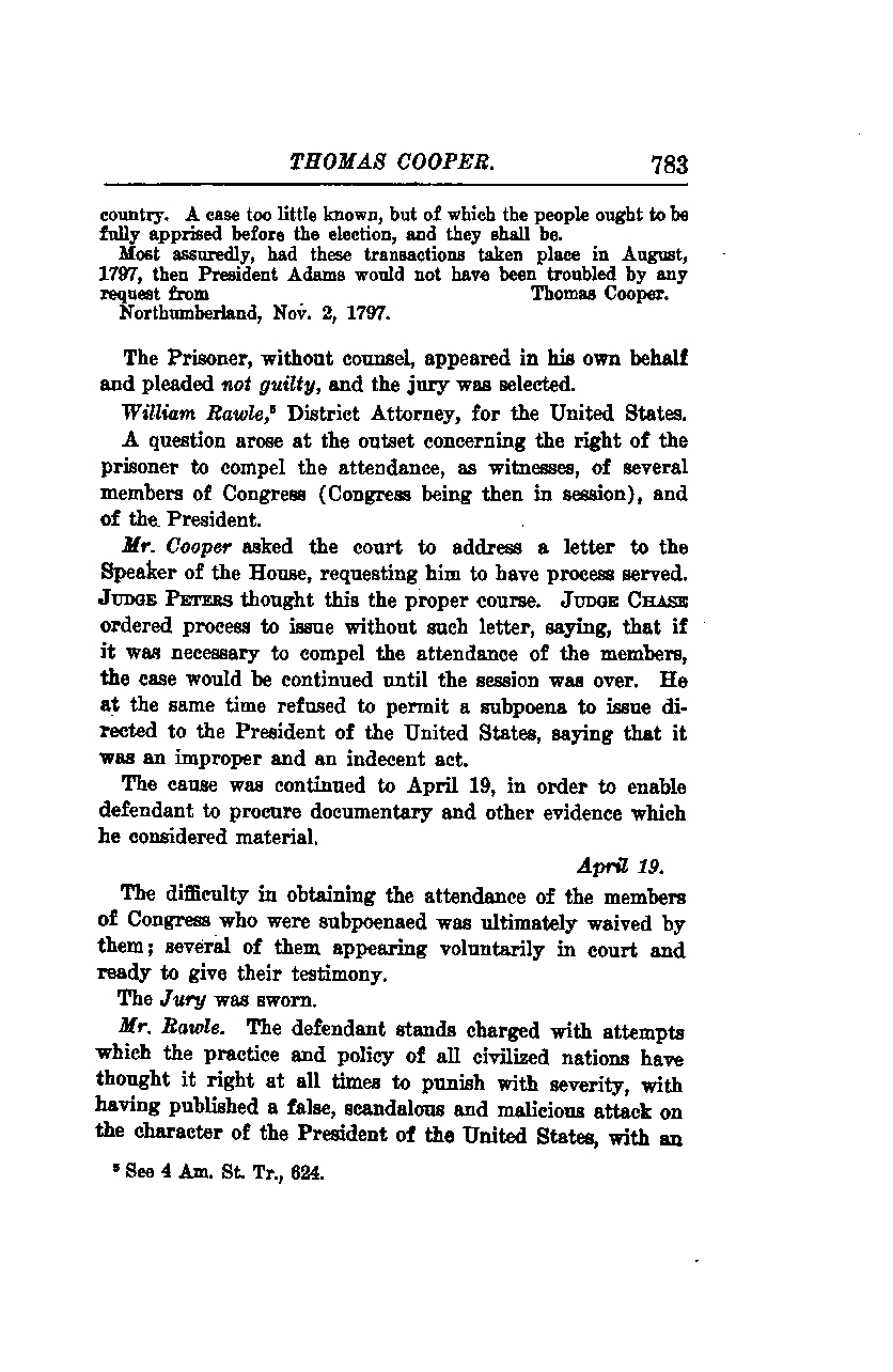 Most assuredly, had these transactions taken place in August 1797, then President Adams would not have been troubled by any request from Thomas Cooper.