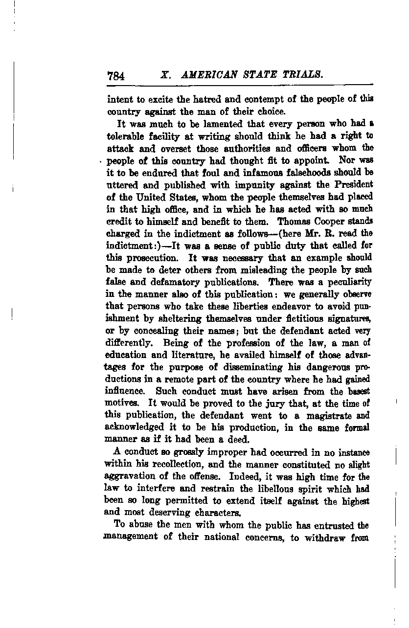 Thomas Cooper stands charged in the indictment as follows—(here Mr. R. read the indictment). It was a sense of public duty that called for this prosecution. It was necessary to set an example to deter others from misleading the people with such false and defamatory publications.