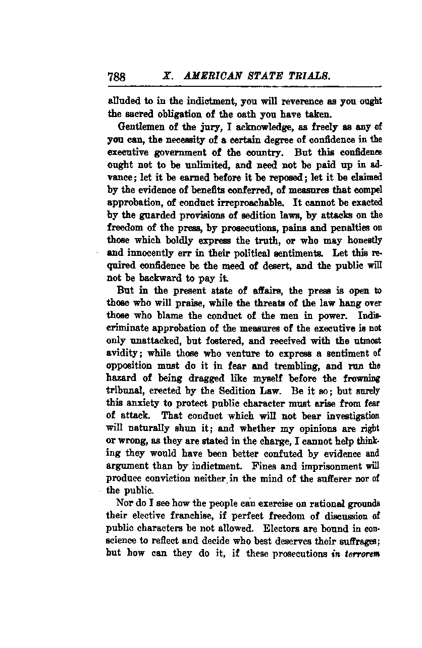 But in the present state of affairs, the press is open to those who will praise, while the threats of the law hang over those who blame the conduct of the men in power. Indiscriminate approbation of the measures of the executive is not only unchallenged but fostered and received with the utmost avidity. Meanwhile, those who venture to express a sentiment of opposition must do so in fear and trembling, running the risk of being dragged, like myself, before the frowning tribunal erected by the Sedition Law. Be it so; but surely this anxiety to protect public character must arise from fear of attack. Conduct that will not bear investigation will naturally shun it. Whether my opinions are right or wrong, as stated in the charge, I cannot help thinking they would have been better refuted by evidence and argument than by indictment. Fines and imprisonment will produce conviction neither in the mind of the sufferer nor in that of the public.