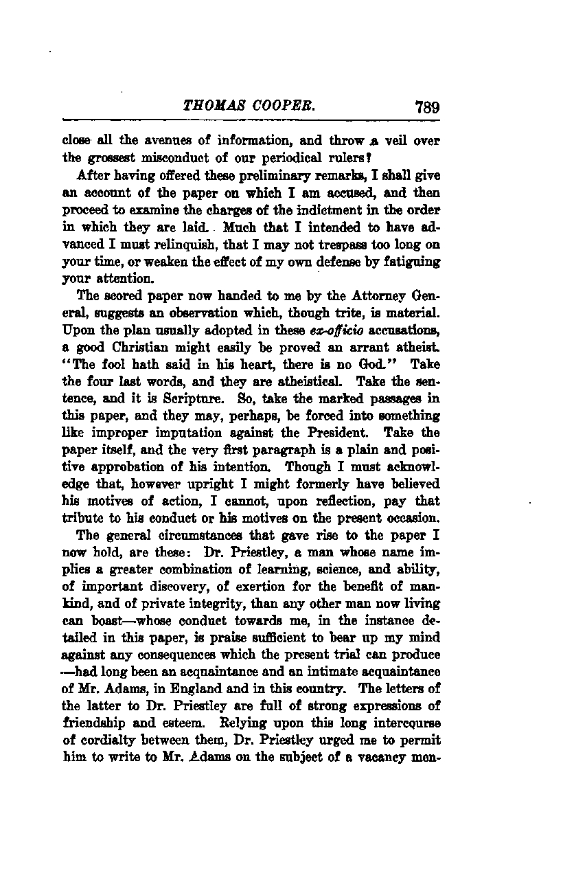 The general circumstances that gave rise to the paper I now hold are these: Dr. Priestley, a man whose name implies a greater combination of learning, science, and ability, of important discovery, of exertion for the benefit of mankind, and of private integrity than any other man now living can boast—whose conduct towards me, in the instance detailed in this paper, is praise sufficient to bear up my mind against any consequences which the present trial can produce—had long been an acquaintance and an intimate acquaintance of Mr. Adams, in England and in this country. The letters of the latter to Dr. Priestley are full of strong expressions of friendship and esteem. Relying upon this long intercourse of cordiality between them, Dr. Priestley urged me to permit him to write to Mr. Adams on the subject of a vacancy mentioned.