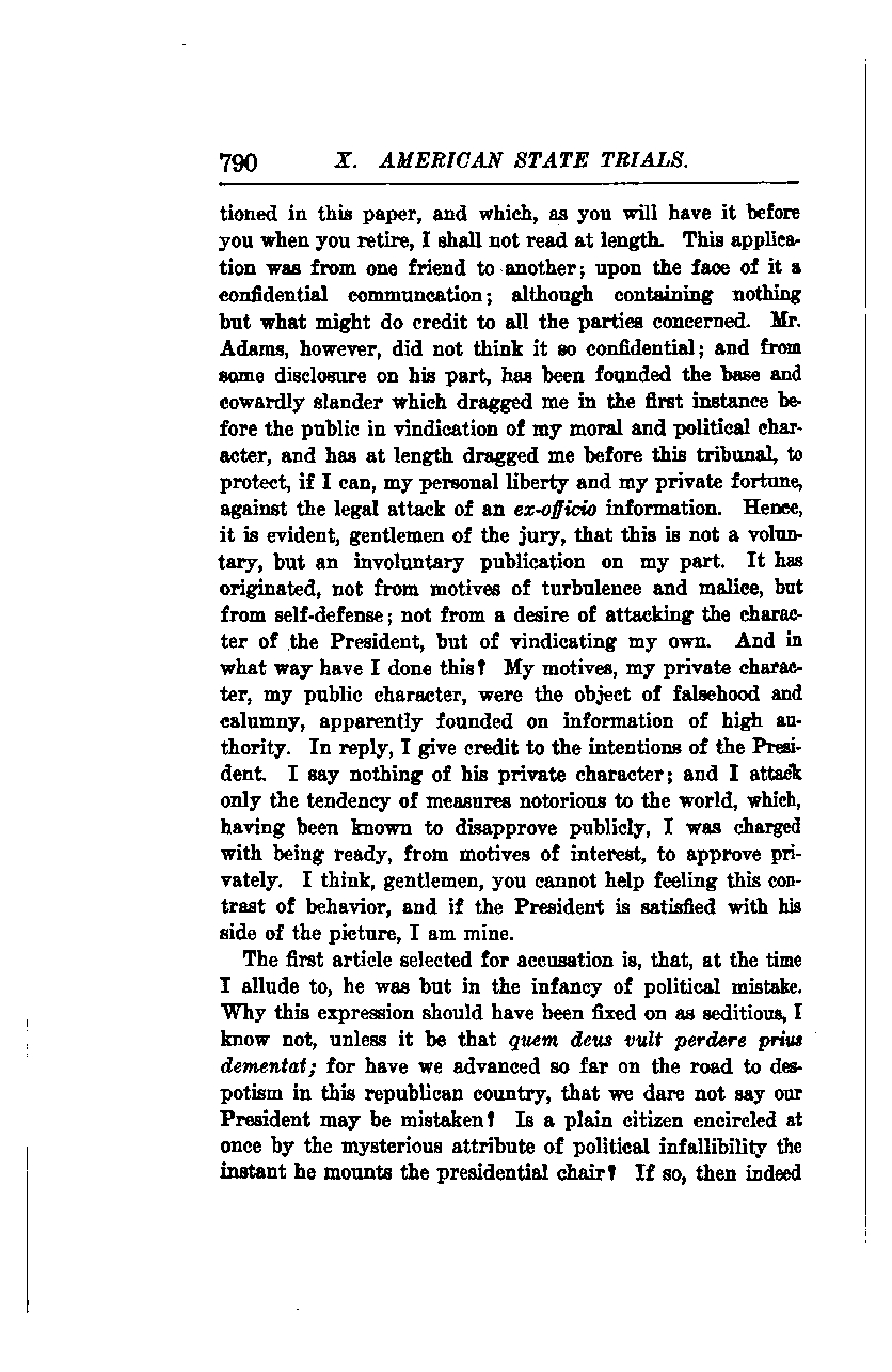 The first article selected for accusation is that, at the time I allude to, he was but in the infancy of political mistake. Why this expression should have been fixed on as seditious, I know not, unless it be that "quem deus vult perdere prius dementat"; for have we advanced so far on the road to despotism in this republican country that we dare not say our President may be mistaken? Is a plain citizen encircled at once by the mysterious attribute of political infallibility the instant he mounts the presidential chair? If so, then indeed...