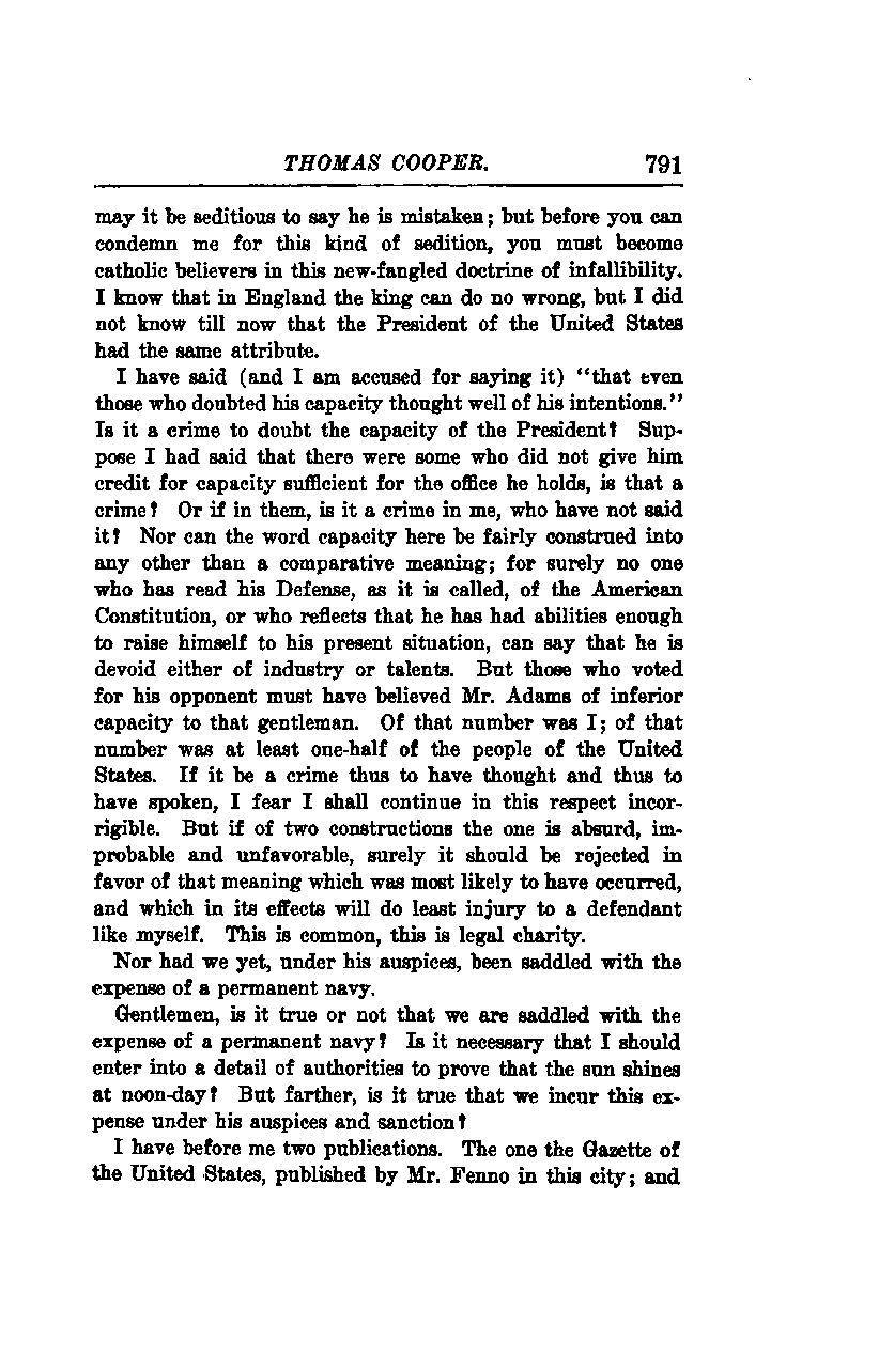 I have said (and I am accused of saying it) that "even those who doubted his capacity thought well of his intentions." Is it a crime to doubt the capacity of the President? Suppose I had said that there were some who did not credit him with sufficient capacity for the office he holds—is that a crime? Or if it is a crime in them, is it a crime in me, who have not said it? Nor can the word "capacity" here be fairly construed into any other than a comparative meaning. Surely, no one who has read his "Defense," as it is called, of the American Constitution, or who reflects that he has had the abilities to raise himself to his present situation, can say that he is devoid of either industry or talents. But those who voted for his opponent must have believed Mr. Adams to be of inferior capacity to that gentleman. I was of that number; at least half of the people of the United States were of that number. If it is a crime to have thought and spoken thus, I fear I shall remain incorrigible in this respect. However, if of two constructions, one is absurd, improbable, and unfavorable, it should be rejected in favor of the meaning most likely to have occurred and which, in its effects, will do the least injury to a defendant like myself. This is common, this is legal charity.