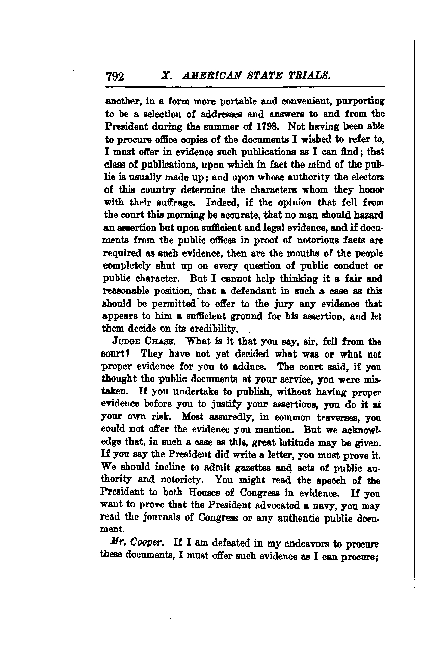 Judge Chase: What is it that you say, sir, fell from the court? They have not yet decided what was or was not proper evidence for you to adduce. The court said that if you thought the public documents were at your service, you were mistaken. If you undertake to publish without having proper evidence before you to justify your assertions, you do it at your own risk. Most assuredly, in common traverses, you could not offer the evidence you mention. But we acknowledge that, in such a case as this, great latitude may be given. If you say the President did write a letter, you must prove it. We should incline to admit gazettes and acts of public authority and notoriety. You might read the speech of the President to both Houses of Congress as evidence. If you want to prove that the President advocated a navy, you may read the journals of Congress or any authentic public document.