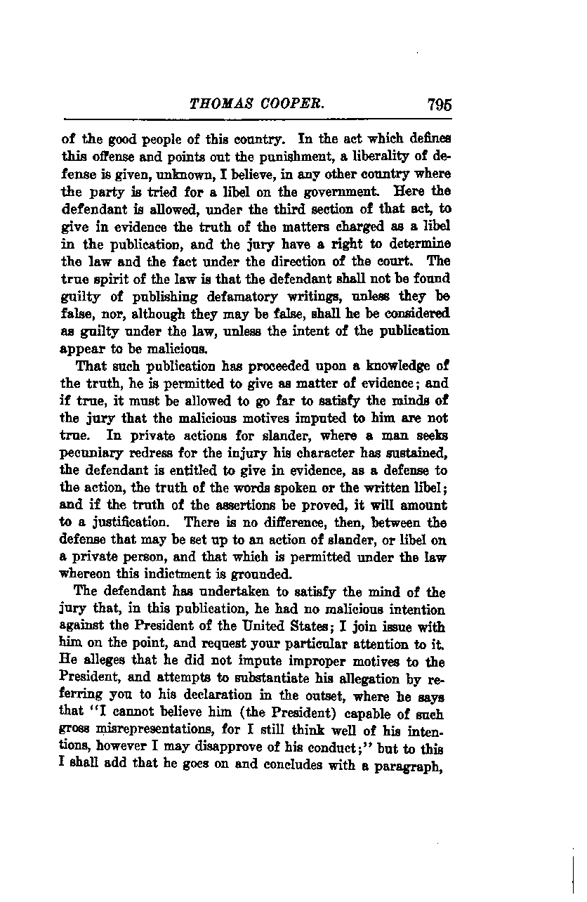 In the act that defines this offense and outlines the punishment, a level of defense is provided that is, I believe, unknown in any other country where the party is tried for a libel against the government. Here, under the third section of that act, the defendant is allowed to present evidence of the truth of the matters charged as a libel in the publication. The jury has the right to determine both the law and the facts under the direction of the court. The true spirit of the law is that the defendant shall not be found guilty of publishing defamatory writings unless they are false. Furthermore, even if they are false, the defendant shall not be considered guilty under the law unless the intent of the publication is proven to be malicious.