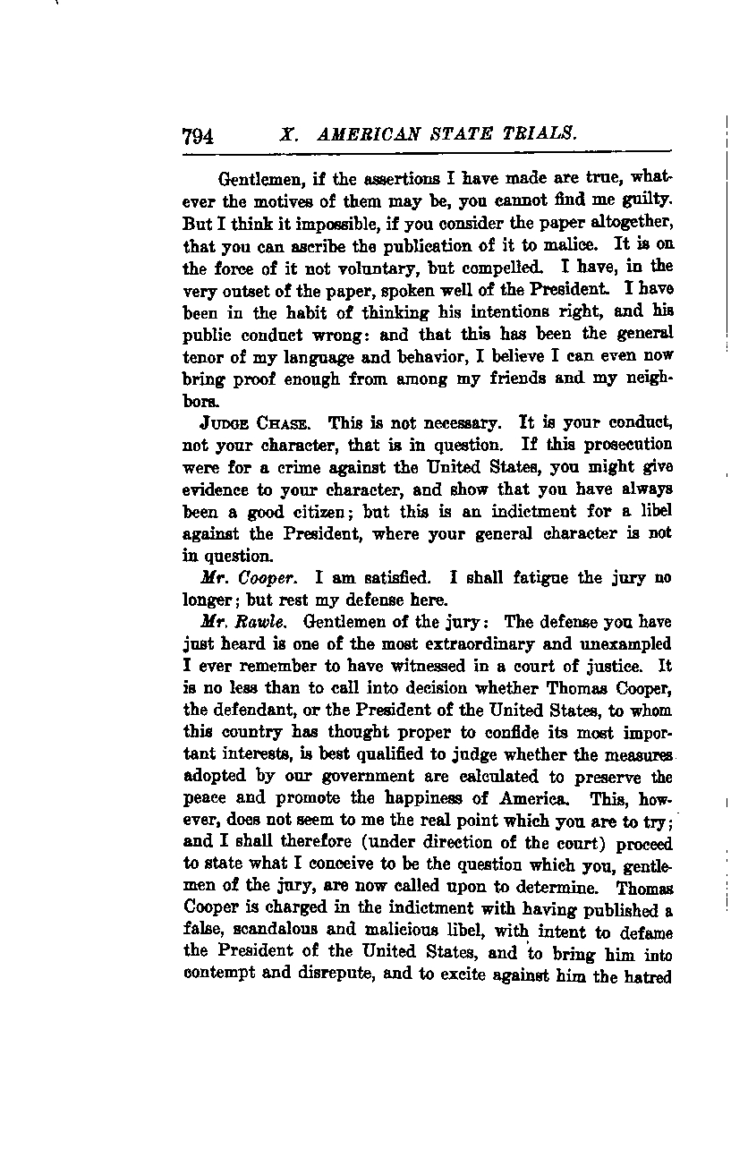 Mr. Rawle: Gentlemen of the jury, the defense you have just heard is one of the most extraordinary and unexampled I have ever witnessed in a court of justice. It is no less than a decision on whether Thomas Cooper, the defendant, or the President of the United States, to whom this country has entrusted its most important interests, is better qualified to judge whether the measures adopted by our government are calculated to preserve the peace and promote the happiness of America. This, however, does not seem to me the real point you are to try. Therefore, I shall (under the direction of the court) proceed to state what I conceive to be the question you, gentlemen of the jury, are now called upon to determine. Thomas Cooper is charged in the indictment with having published a false, scandalous, and malicious libel, with the intent to defame the President of the United States, to bring him into contempt and disrepute, and to incite hatred against him.