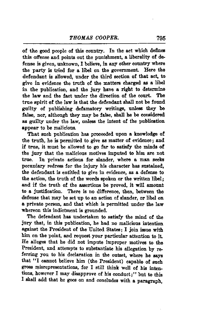 In the act that defines this offense and outlines the punishment, a level of defense is provided that is, to my knowledge, unknown in any other country where a party is tried for a libel against the government. Here, the defendant is allowed, under the third section of that act, to present evidence of the truth of the matters charged as a libel in the publication. The jury has the right to determine both the law and the facts under the direction of the court. The true spirit of the law is that the defendant shall not be found guilty of publishing defamatory writings unless they are false. Furthermore, even if they are false, the defendant shall not be considered guilty under the law unless the intent of the publication is proven to be malicious.