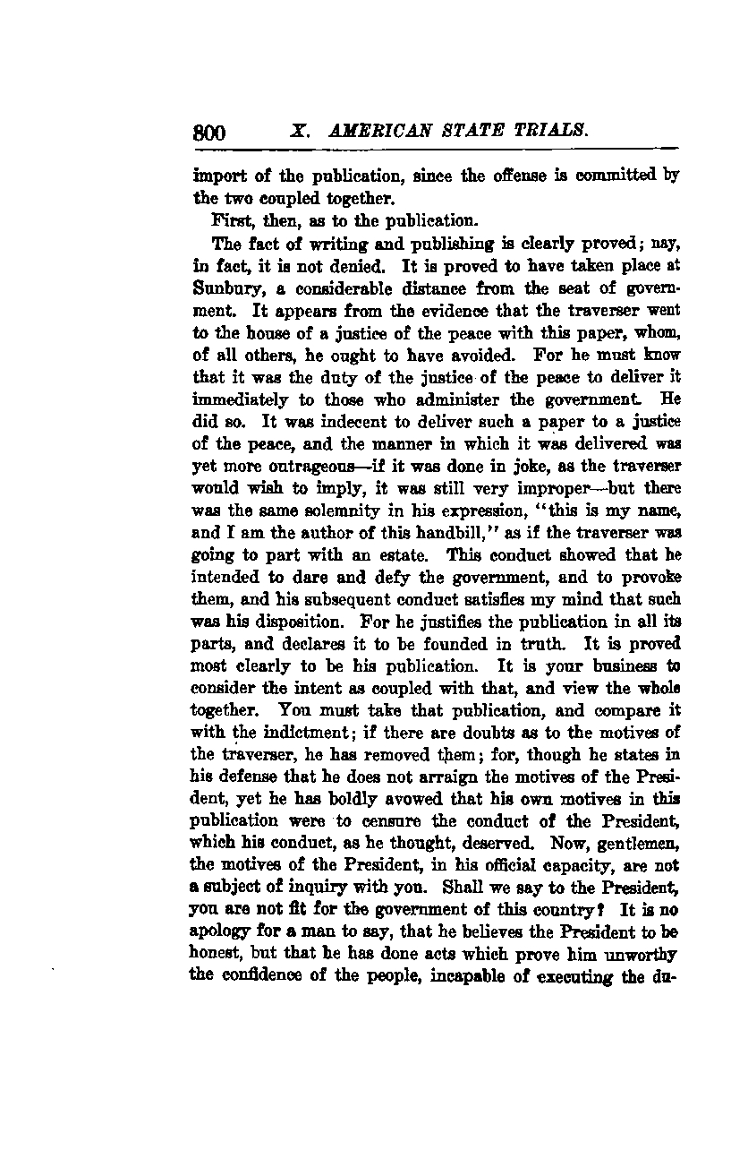This conduct showed that he intended to dare and defy the government and to provoke them. His subsequent conduct satisfies my mind that such was his disposition. He justifies the publication in all its parts and declares it to be founded in truth. It is proven most clearly to be his publication. It is your responsibility to consider the intent as coupled with that and view the whole together. You must take that publication and compare it with the indictment. If there are doubts as to the motives of the traverser, he has removed them. For, though he states in his defense that he does not question the motives of the President, he has boldly avowed that his own motives in this publication were to censure the conduct of the President, which he believed deserved criticism.