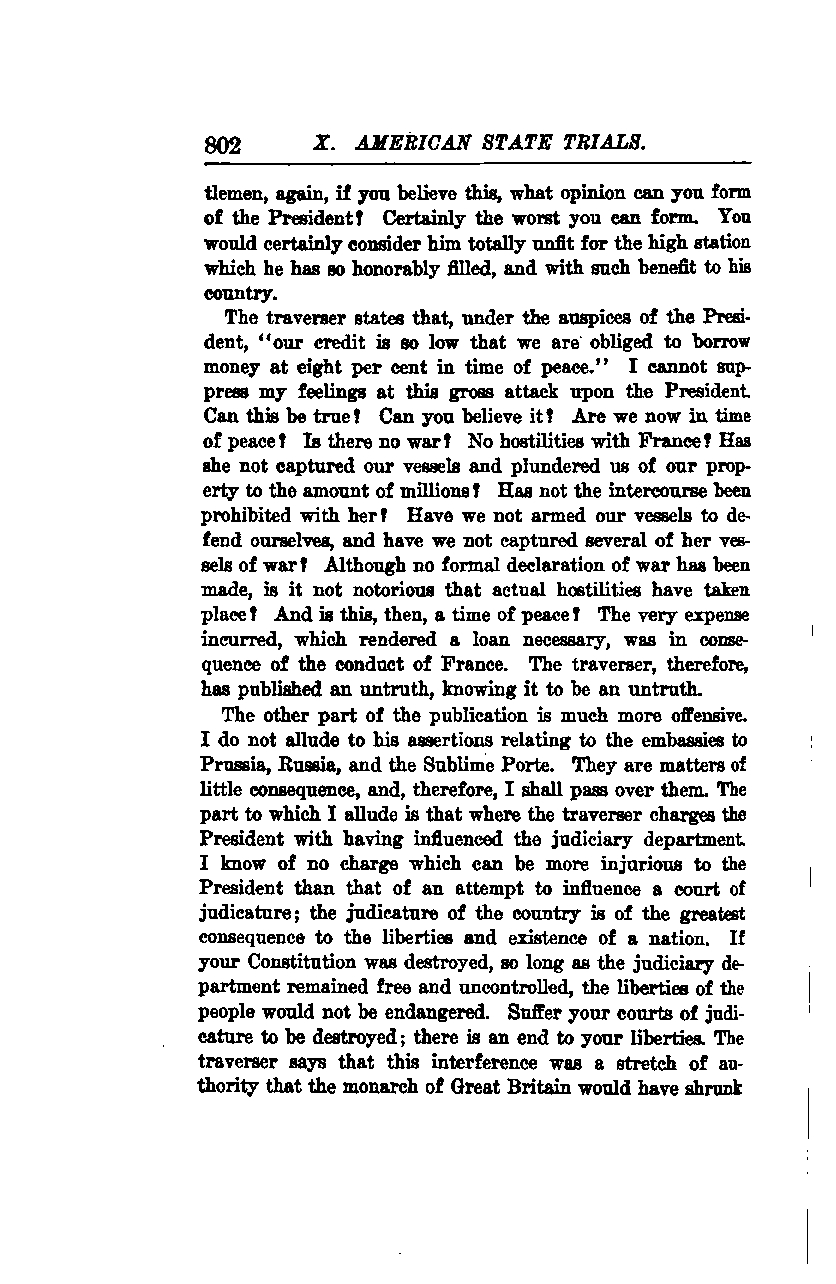 The traverser states that, under the auspices of the President, "our credit is so low that we are obliged to borrow money at eight percent in time of peace." I cannot suppress my feelings at this gross attack upon the President. Can this be true? Can you believe it? Are we now in a time of peace? Is there no war? No hostilities with France? Has she not captured our vessels and plundered us of our property to the amount of millions? Has not the intercourse been prohibited with her? Have we not armed our vessels to defend ourselves, and have we not captured several of her vessels of war? Although no formal declaration of war has been made, is it not notorious that actual hostilities have taken place? And is this, then, a time of peace? The very expense incurred, which rendered a loan necessary, was in consequence of the conduct of France. The traverser, therefore, has published an untruth, knowing it to be an untruth.