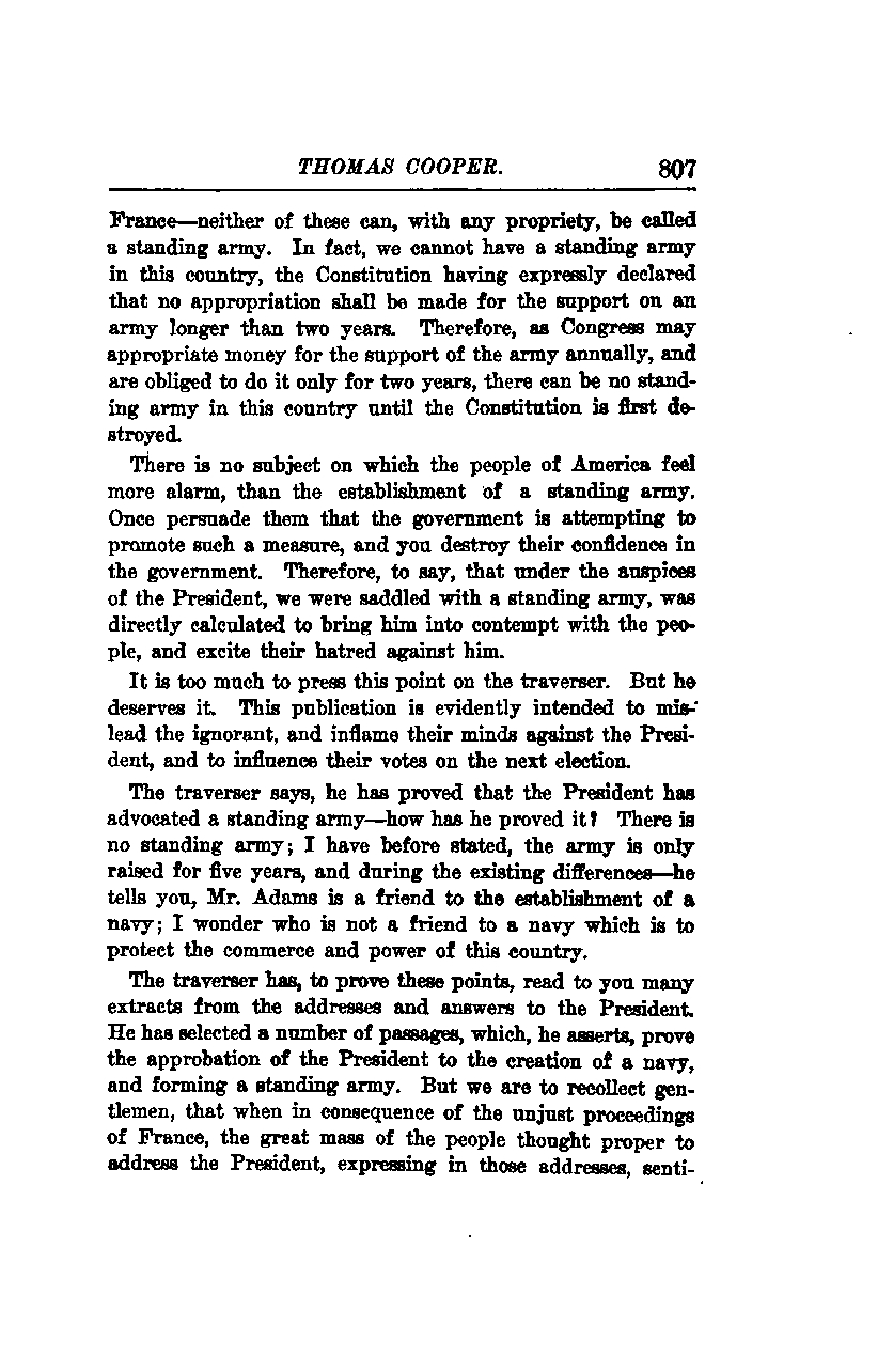 The traverser has, to prove these points, read to you many extracts from the addresses and answers to the President. He has selected a number of passages, which he asserts prove the President's approval of the creation of a navy and the formation of a standing army. But we are to recollect, gentlemen, that when, in consequence of the unjust proceedings of France, the great mass of the people thought it proper to address the President, expressing in those addresses sentiments...