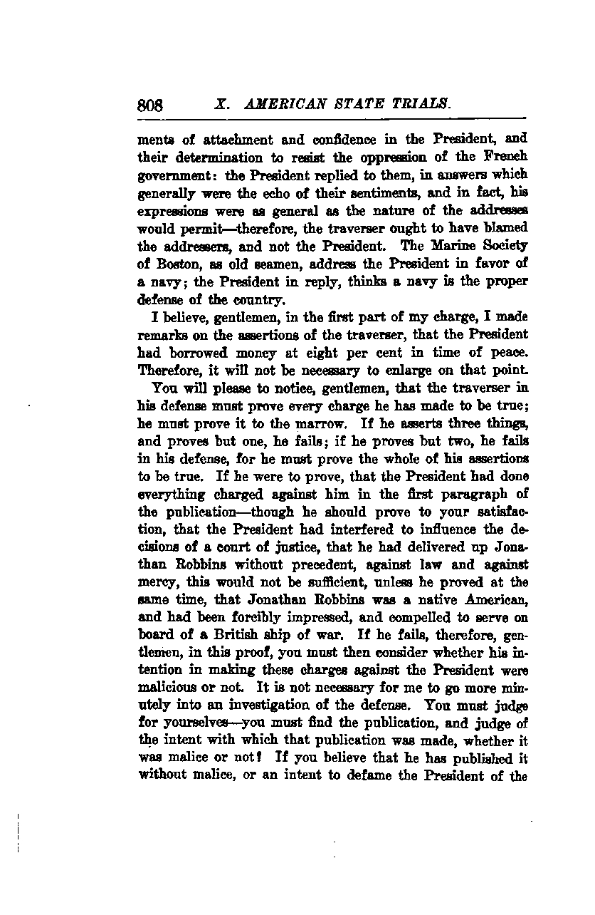 Please note, gentlemen, that in his defense, the traverser must prove every charge he has made to be true; he must prove it thoroughly. If he asserts three things and proves only one, he fails. If he proves only two, he still fails in his defense, for he must prove the entirety of his assertions to be true. Even if he were to prove that the President had done everything charged against him in the first paragraph of the publication—such as interfering to influence the decisions of a court of justice, or delivering up Jonathan Robbins without precedent, against law, and against mercy—this would not be sufficient unless he also proved that Jonathan Robbins was a native American who had been forcibly impressed and compelled to serve on board a British ship of war.