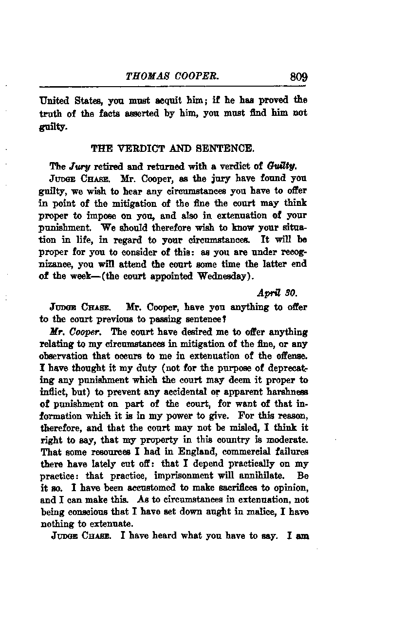 Judge Chase: Mr. Cooper, as the jury has found you guilty, we wish to hear any circumstances you have to offer in mitigation of the fine the court may think proper to impose on you, and also in extenuation of your punishment. We would therefore like to know your situation in life, particularly regarding your circumstances. It will be proper for you to consider this: as you are under recognizance, you will attend the court sometime towards the latter end of the week—(the court appointed Wednesday).