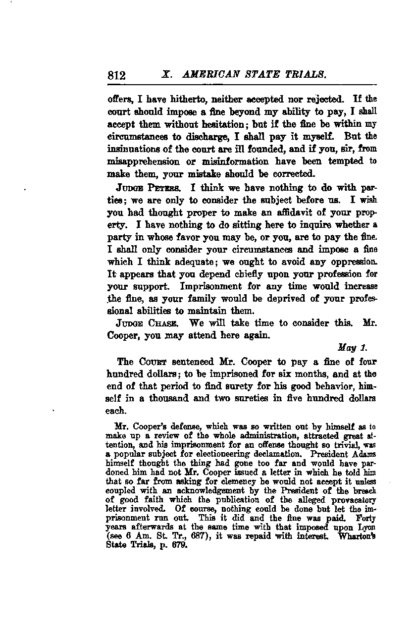 Mr. Cooper’s defense, which he wrote himself as a review of the whole administration, attracted great attention. His imprisonment for an offense thought so trivial became a popular subject for electioneering declamation. President Adams himself thought the matter had gone too far and would have pardoned him had Mr. Cooper not issued a letter stating that, far from asking for clemency, he would not accept it unless coupled with an acknowledgment by the President of the breach of good faith involved in the publication of the alleged provocative letter. Of course, nothing could be done but to let the imprisonment run its course. This it did, and the fine was paid. Forty years later, at the same time as that imposed upon Lyon (see 6 Am. St. Tr., 687), it was repaid with interest. Wharton's State Trials, p. 670.