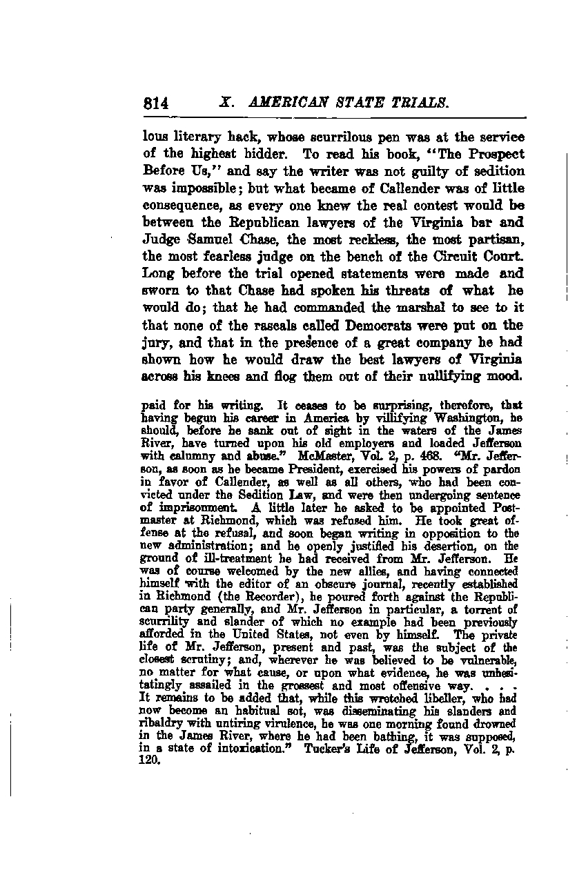 James Callender was a notorious literary hack, whose scurrilous pen was at the service of the highest bidder. To read his book, "The Prospect Before Us," and claim the writer was not guilty of sedition was impossible. However, what became of Callender was of little consequence, as everyone knew the real contest would be between the Republican lawyers of the Virginia bar and Judge Samuel Chase. Chase was the most reckless, partisan, and fearless judge on the bench of the Circuit Court.