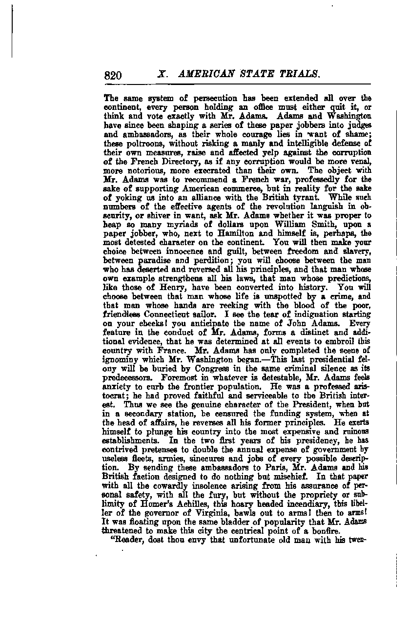 Every feature in the conduct of Mr. Adams forms a distinct and additional evidence that he was determined at all events to embroil this country with France. Mr. Adams has only completed the scene of ignominy which Mr. Washington began. This last presidential felony will be buried by Congress in the same criminal silence as its predecessors. Foremost in whatever is detestable, Mr. Adams feels anxiety to curb the frontier population. He was a professed aristocrat; he had proved faithful and serviceable to the British interest.