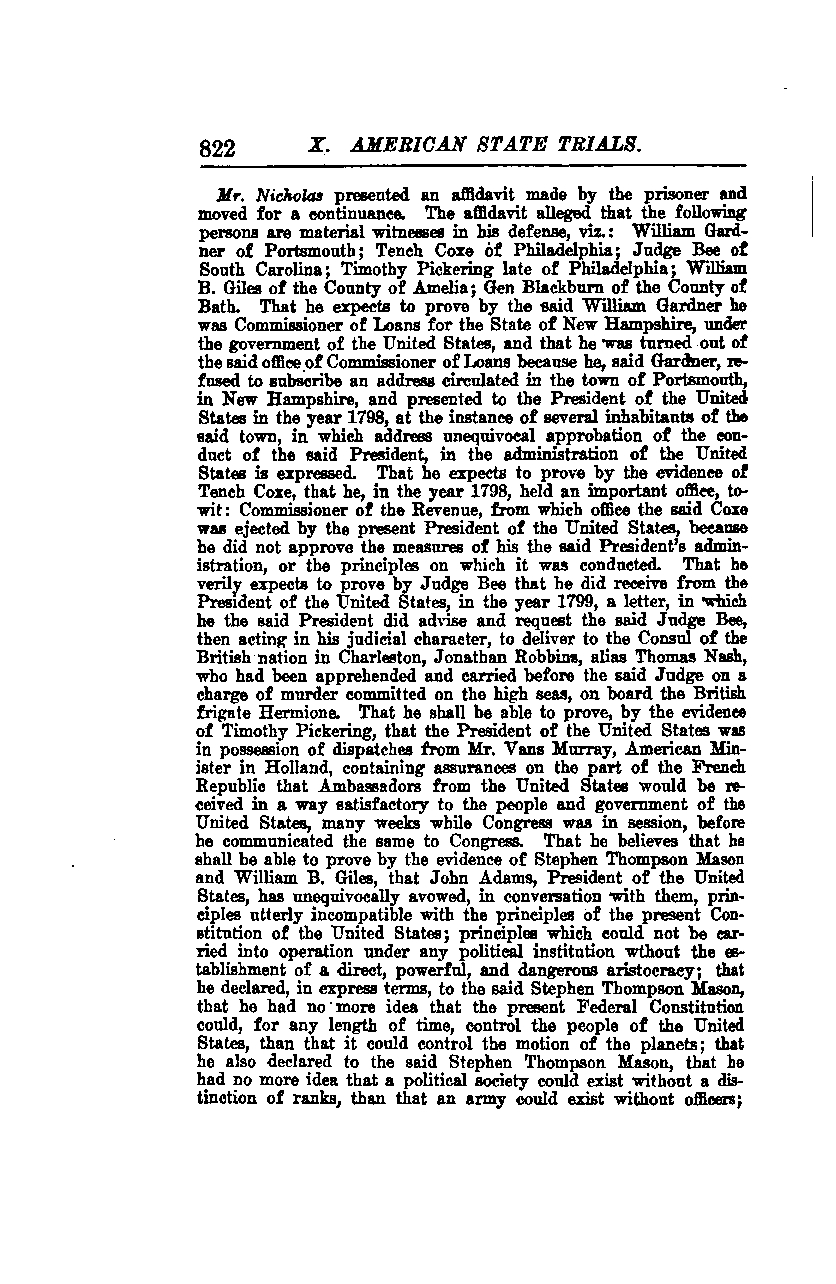 Mr. Nickolas presented an affidavit made by the prisoner and moved for a continuance. The affidavit alleged that the following persons are material witnesses in his defense: William Gardner of Portsmouth; Tench Coxe of Philadelphia; Judge Bee of South Carolina; Timothy Pickering, late of Philadelphia; William B. Giles of the County of Amelia; and Gen. Blackburn of the County of Bath.