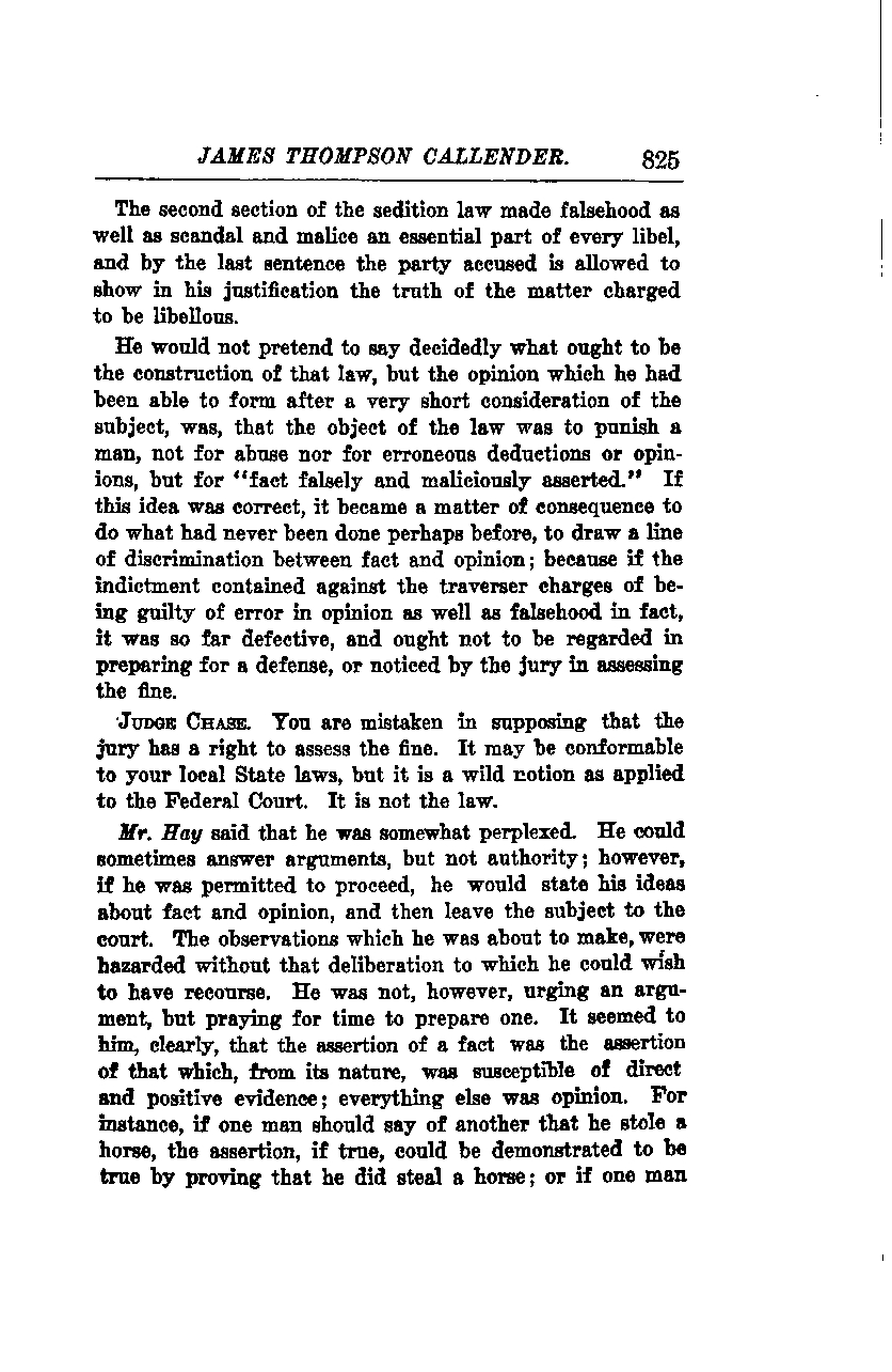 Mr. Hay said that he was somewhat perplexed. He could sometimes answer arguments, but not authority. However, if he was permitted to proceed, he would state his ideas about fact and opinion and then leave the subject to the court. The observations he was about to make were hazarded without the deliberation to which he could wish to have recourse. He was not, however, urging an argument but praying for time to prepare one. It seemed to him, clearly, that the assertion of a fact was the assertion of that which, from its nature, was susceptible to direct and positive evidence; everything else was opinion. For instance, if one man should say of another that he stole a horse, the assertion, if true, could be demonstrated to be true by proving that he did steal a horse.