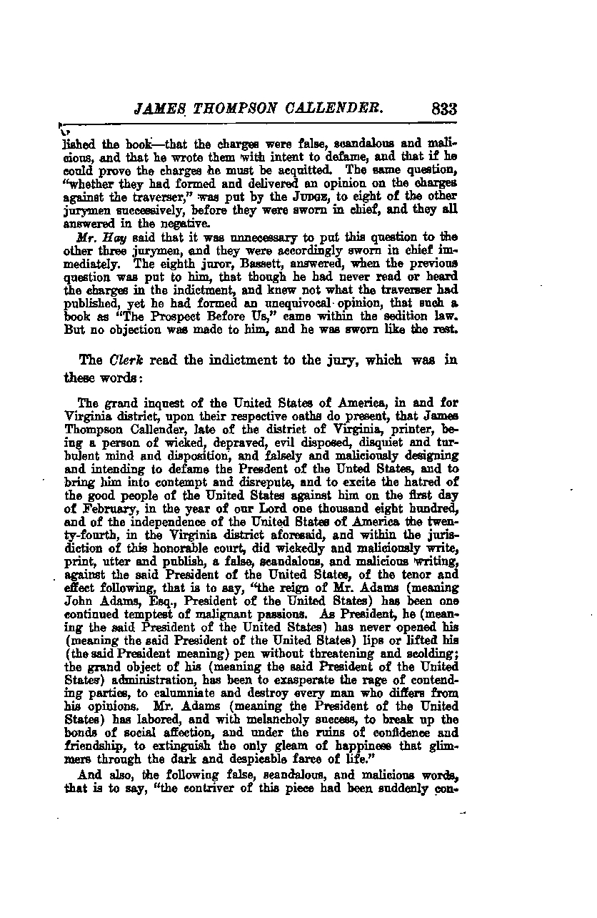The grand inquest of the United States of America, in and for the Virginia district, upon their respective oaths, do present that James Thompson Callender, late of the district of Virginia, printer, being a person of wicked, depraved, evil-disposed, disquiet, and turbulent mind and disposition, and falsely and maliciously designing and intending to defame the President of the United States, and to bring him into contempt and disrepute, and to excite the hatred of the good people of the United States against him on the first day of February, in the year of our Lord one thousand eight hundred, and of the independence of the United States of America the twenty-fourth, in the Virginia district aforesaid, and within the jurisdiction of this honorable court, did wickedly and maliciously write, print, utter, and publish a false, scandalous, and malicious writing against the said President of the United States, of the tenor and effect following, that is to say: