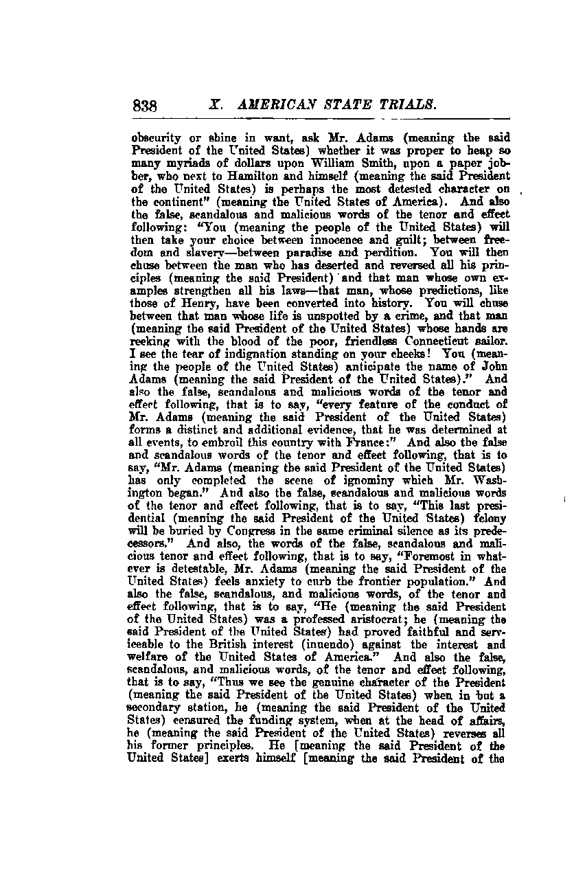 And also the words of the false, scandalous, and malicious tenor and effect following, that is to say, "Foremost in whatever is detestable, Mr. Adams (meaning the said President of the United States) feels anxiety to curb the frontier population."