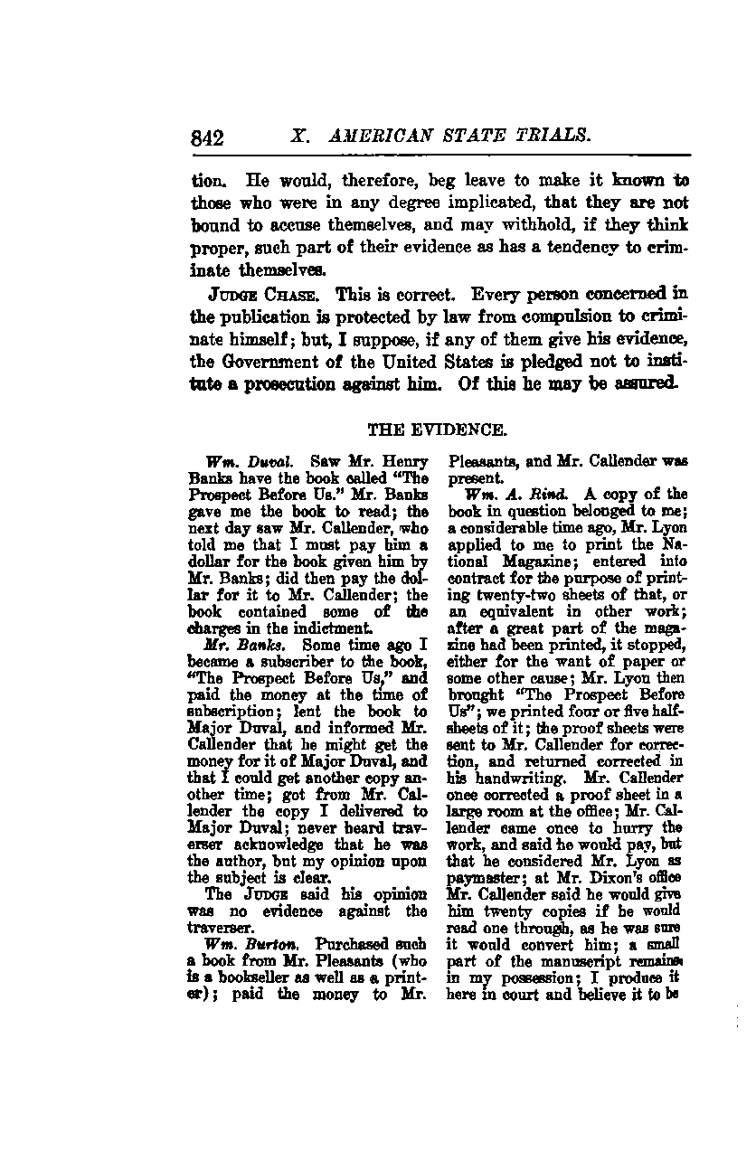 **Mr. Banks:** Some time ago, I became a subscriber to the book, "The Prospect Before Us," and paid the money at the time of subscription. I lent the book to Major Duval and informed Mr. Callender that he might get the money for it from Major Duval, and that I could get another copy at another time. I got from Mr. Callender the copy I delivered to Major Duval. I never heard the traverser acknowledge that he was the author, but my opinion on the subject is clear.