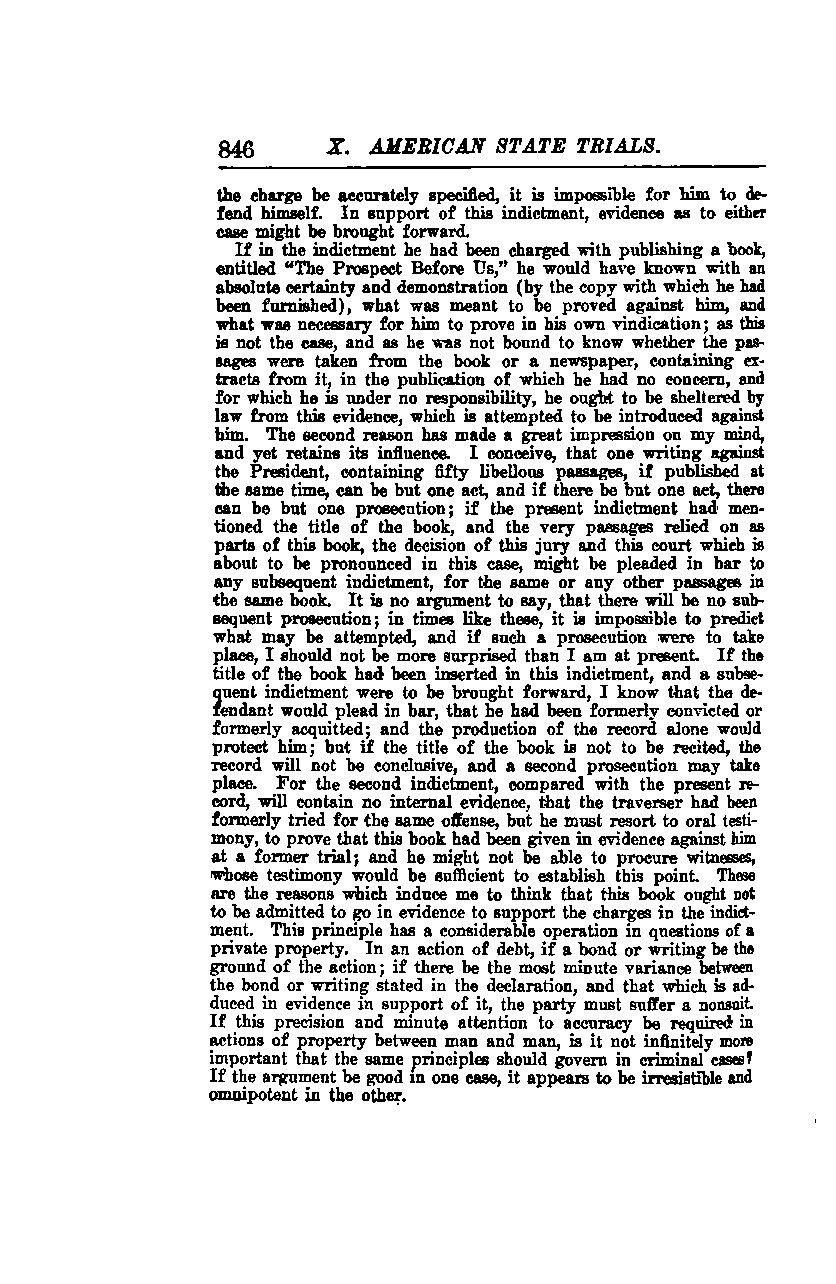 The second reason has made a significant impression on my mind and continues to influence me. I believe that a single writing against the President, containing fifty libelous passages, if published simultaneously, constitutes only one act. If there is only one act, there can be only one prosecution. If the present indictment had mentioned the title of the book and the specific passages relied upon as parts of this book, the decision of this jury and this court, which is about to be pronounced in this case, might be used as a defense against any subsequent indictment for the same or any other passages in the same book. It is not a valid argument to say that there will be no subsequent prosecution; in times like these, it is impossible to predict what may be attempted. If such a prosecution were to occur, I would not be more surprised than I am at present.