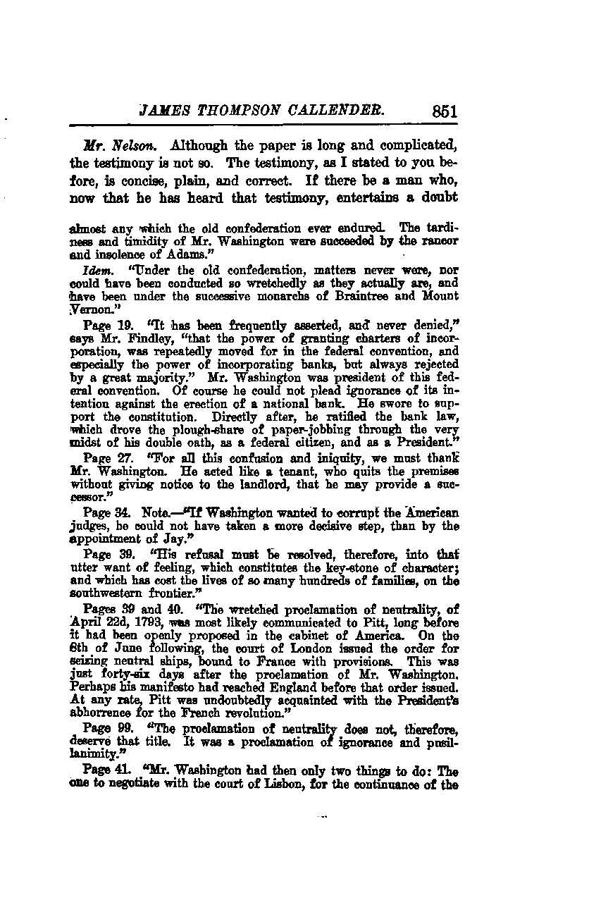Page 19: "It has been frequently asserted, and never denied," says Mr. Findley, "that the power of granting charters of incorporation was repeatedly moved for in the federal convention, and especially the power of incorporating banks, but always rejected by a great majority." Mr. Washington was president of this federal convention. Of course, he could not plead ignorance of its intention against the erection of a national bank. He swore to support the constitution. Directly after, he ratified the bank law, which drove the plowshare of paper jobbing through the very midst of his double oath, as a federal citizen and as a President.