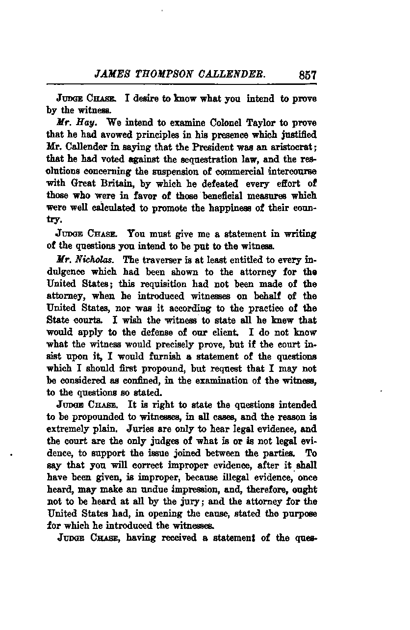 **Judge Chase:** It is right to state the questions intended to be propounded to witnesses in all cases, and the reason is extremely plain. Juries are only to hear legal evidence, and the court is the only judge of what is or is not legal evidence to support the issue joined between the parties. To say that you will correct improper evidence after it shall have been given is improper, because illegal evidence, once heard, may make an undue impression and, therefore, ought not to be heard at all by the jury. The attorney for the United States had, in opening the cause, stated the purpose for which he introduced the witnesses.