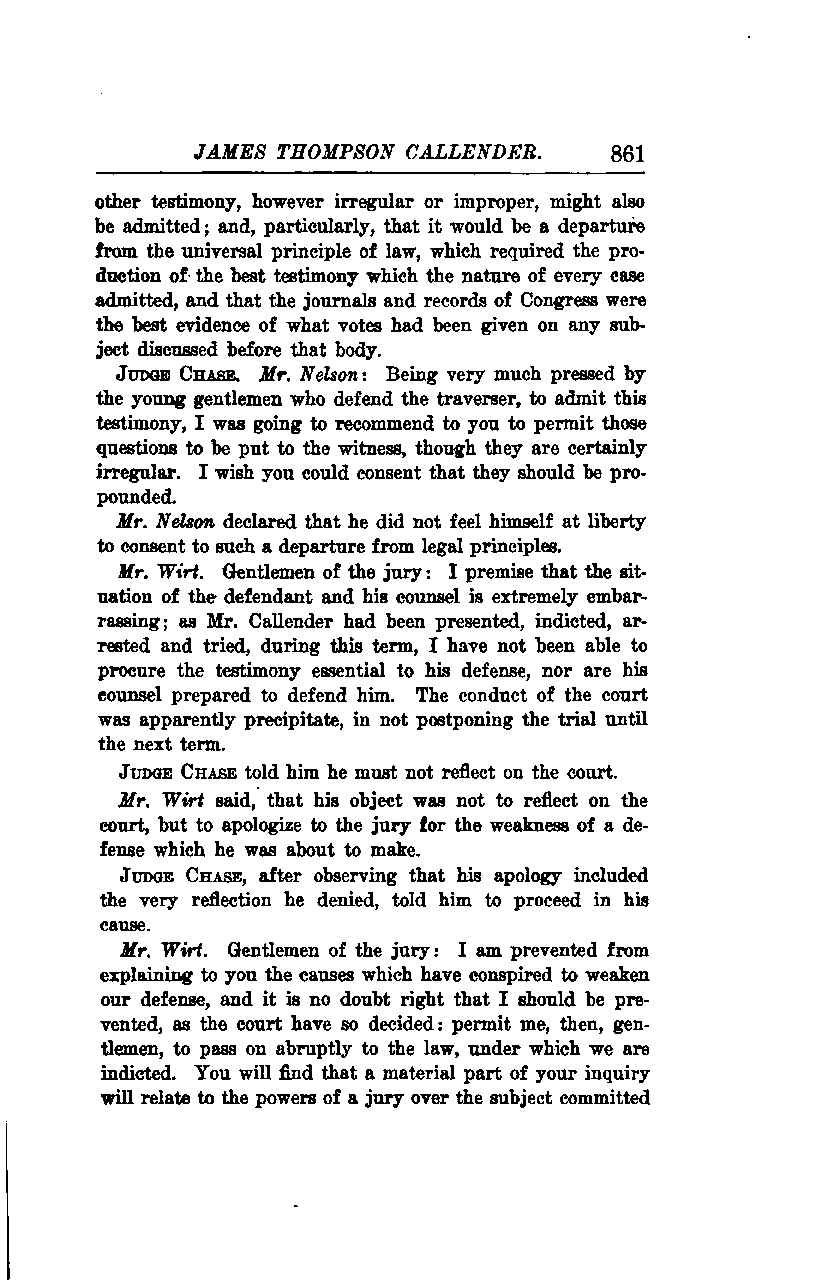 Mr. Wirt: Gentlemen of the jury, I premise that the situation of the defendant and his counsel is extremely embarrassing. As Mr. Callender had been presented, indicted, arrested, and tried during this term, I have not been able to procure the testimony essential to his defense, nor are his counsel prepared to defend him. The conduct of the court was apparently precipitate in not postponing the trial until the next term.
