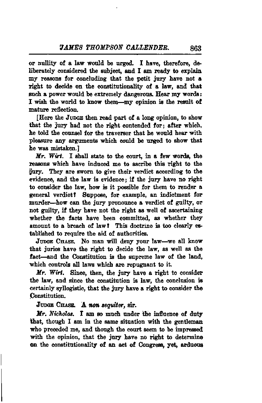 Mr. Nicholas: I am so much under the influence of duty that, though I am in the same situation as the gentleman who preceded me, and though the court seems to be impressed with the opinion that the jury has no right to determine the constitutionality of an act of Congress, yet, arduous as it may be...