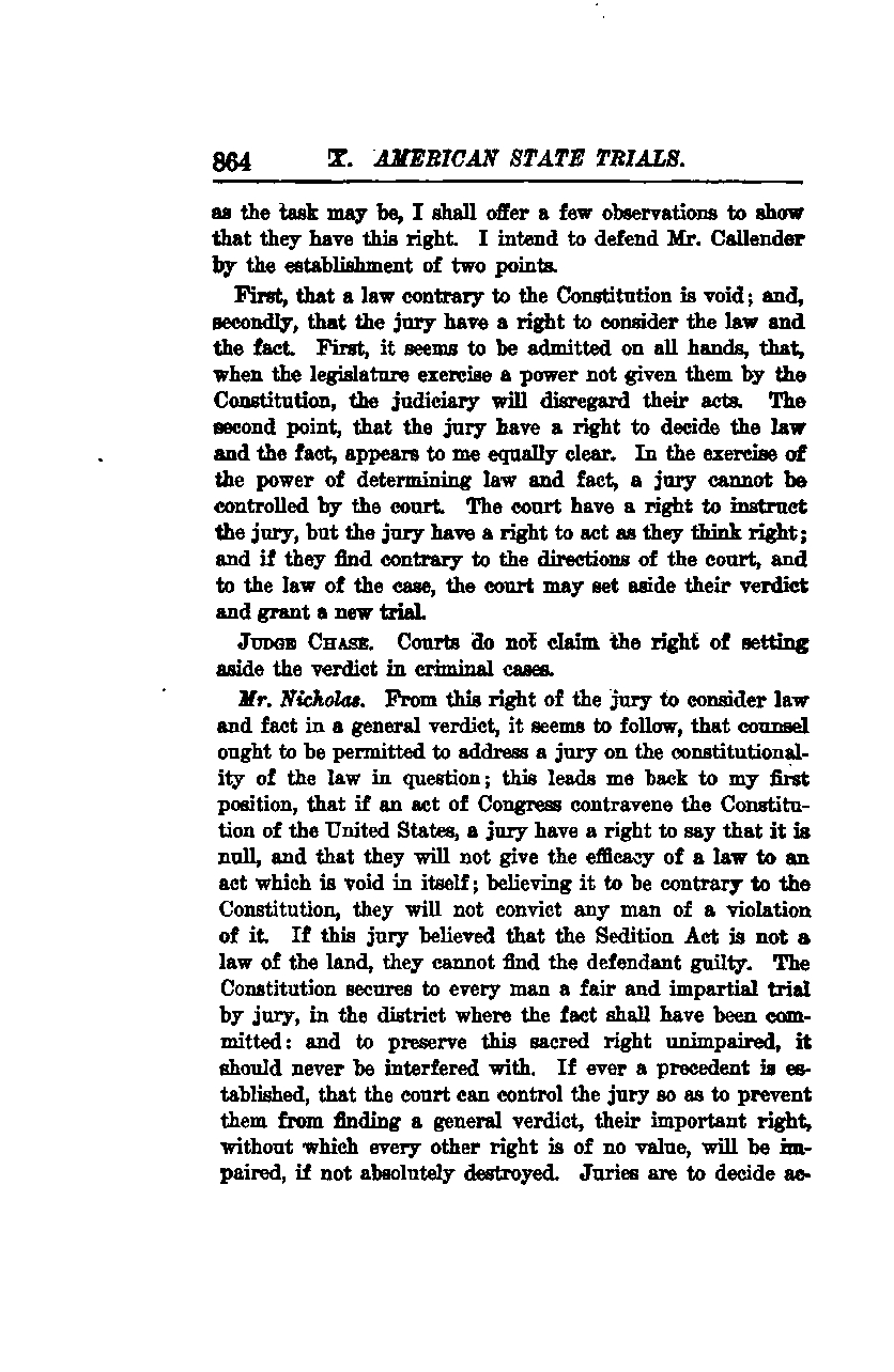 Mr. Nicholas: From this right of the jury to consider law and fact in a general verdict, it seems to follow that counsel should be permitted to address a jury on the constitutionality of the law in question. This brings me back to my initial position: if an act of Congress contravenes the Constitution of the United States, a jury has the right to declare it null and refuse to give it the efficacy of a law. Believing it to be contrary to the Constitution, they will not convict any man of violating it. If this jury believes that the Sedition Act is not a law of the land, they cannot find the defendant guilty.