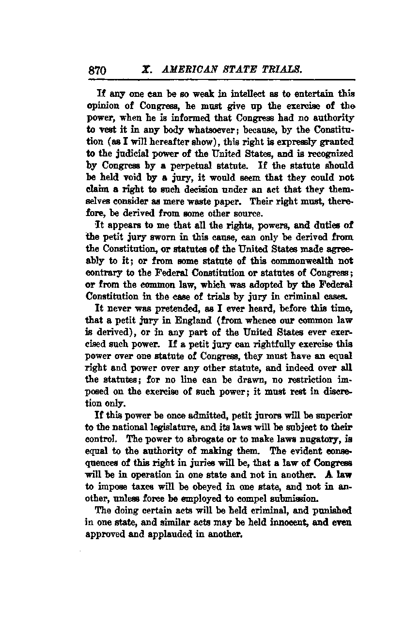 If anyone can be so weak in intellect as to entertain this opinion of Congress, they must give up the exercise of the power when informed that Congress had no authority to vest it in any body whatsoever. This is because, as I will hereafter show, the Constitution expressly grants this right to the judicial power of the United States, and it is recognized by Congress through a perpetual statute. If the statute were to be held void by a jury, it would seem that they could not claim a right to such a decision under an act that they themselves consider mere waste paper. Therefore, their right must be derived from some other source.