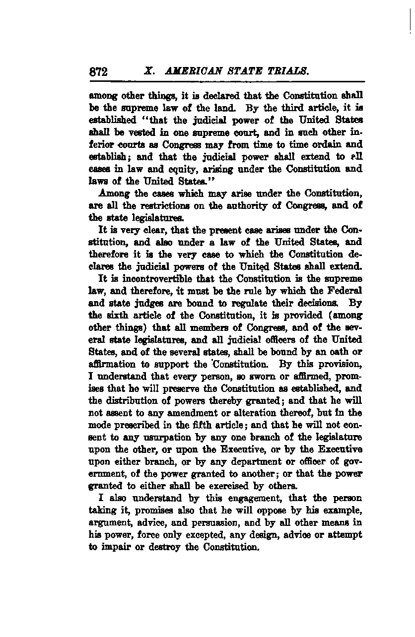 It is incontrovertible that the Constitution is the supreme law, and therefore, it must be the rule by which the federal and state judges are bound to regulate their decisions. By the sixth article of the Constitution, it is provided (among other things) that all members of Congress, and of the several state legislatures, and all judicial officers of the United States, and of the several states, shall be bound by an oath or affirmation to support the Constitution.
