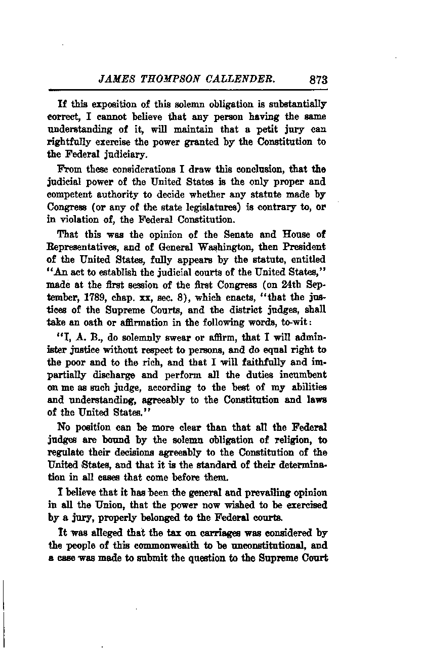 If this exposition of this solemn obligation is substantially correct, I cannot believe that any person with the same understanding of it will maintain that a petit jury can rightfully exercise the power granted by the Constitution to the Federal judiciary.