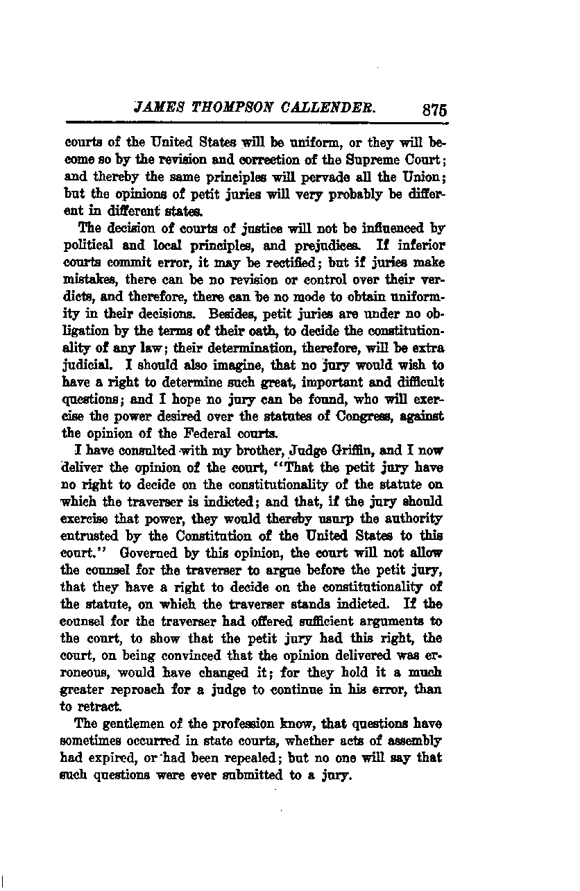 The decisions of courts of justice will not be influenced by political and local principles and prejudices. If inferior courts commit errors, these can be rectified. However, if juries make mistakes, there is no revision or control over their verdicts, and therefore, no mode to obtain uniformity in their decisions. Additionally, petit juries are under no obligation, by the terms of their oath, to decide the constitutionality of any law; their determination, therefore, will be extra-judicial. I also imagine that no jury would wish to have the right to determine such great, important, and difficult questions. I hope no jury can be found that will exercise the power desired over the statutes of Congress against the opinion of the Federal courts.