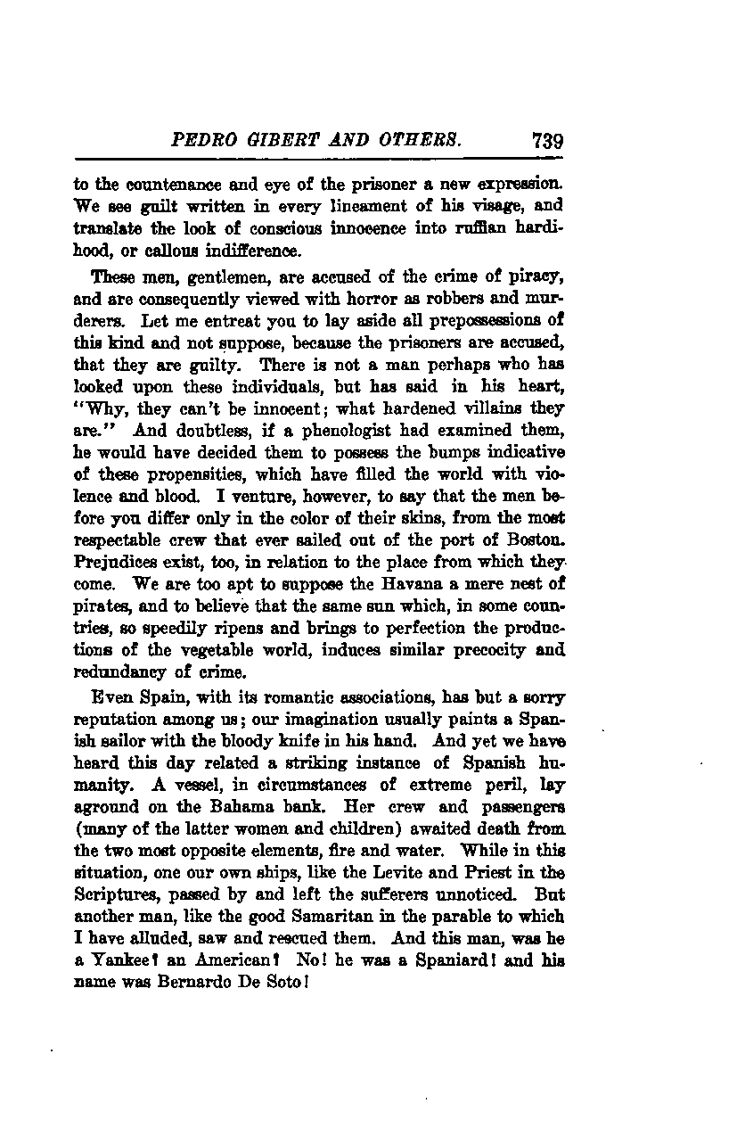 Here is the translated text as follows:PEDRO GIBERT AND OTHERSTo the countenance and eye of the prisoner, a new expression emerges. We see guilt written in every lineament of his visage, and we translate the look of conscious innocence into ruffian hardiness or callous indifference.These men, gentlemen, are accused of the crime of piracy and are consequently viewed with horror as robbers and murderers. Let me entreat you to lay aside all prepossessions of this kind and not suppose, because the prisoners are accused, that they are guilty. There is not a man, perhaps, who has looked upon these individuals