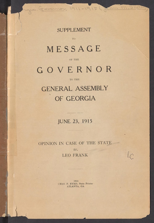 Governor To The General Assembly Of Georgia June 23 1915 State Vs Leo Frank Page 1